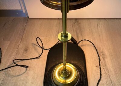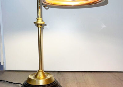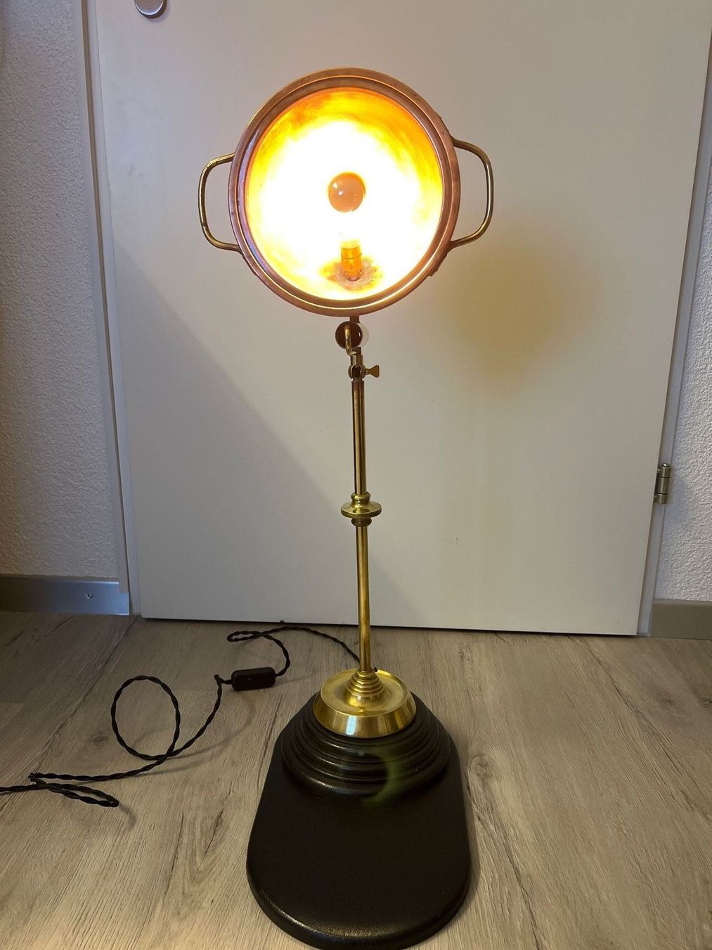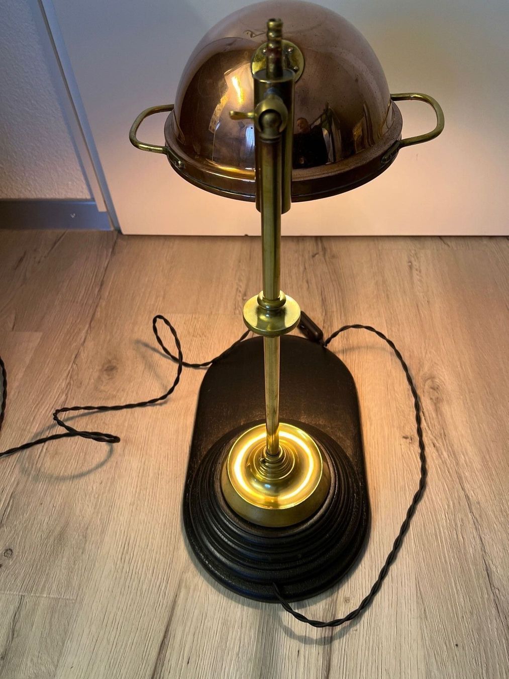 Das warme Kupfer fängt den Glanz der Glühbirne auf, spiegelt ihn zurück und schenkt ein Licht, das fast golden wirkt. Die schlanke Messingstange erhebt sich aus einem Fuss, der schichtweise geformt ist, und ruht auf einer schwarzen Holzplatte, deren sanft verlängerte Form auch Platz zum Ablegen bietet.