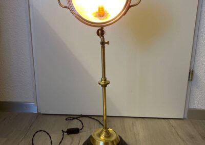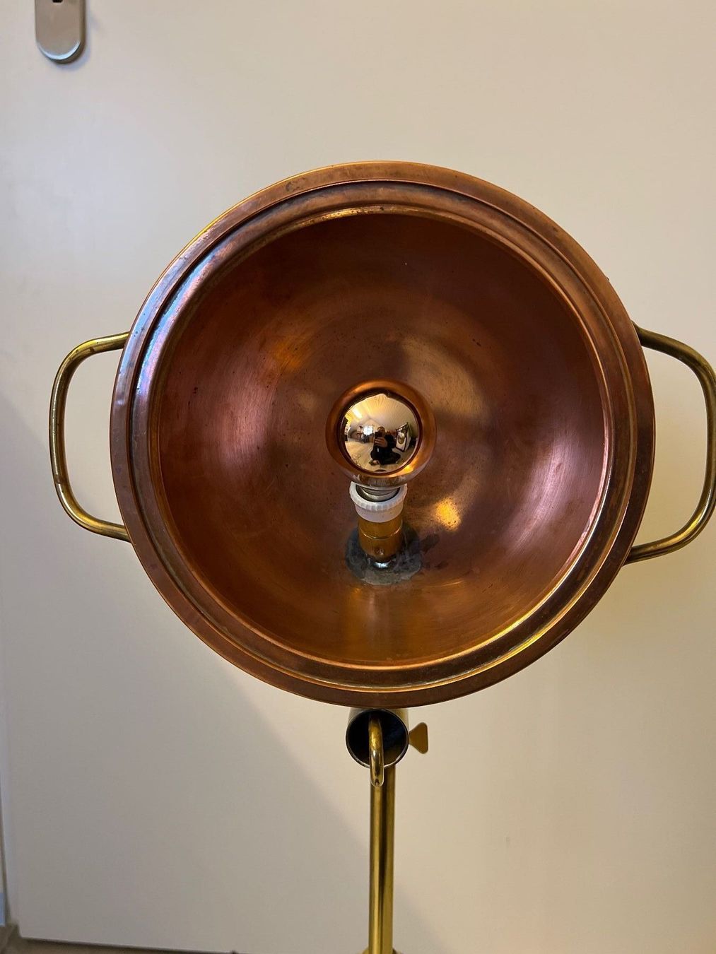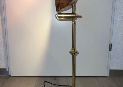 Wenn Kupfer und Messing sich begegnen, entsteht ein Licht, das zugleich vertraut und neu wirkt. Der Schirm, einst Deckel eines alten Reaktionsgefässes, hat mit seinen seitlichen Griffen und dem kleinen Ventil eine Geschichte in sich – heute erzählt er sie in leuchtender Form weiter.